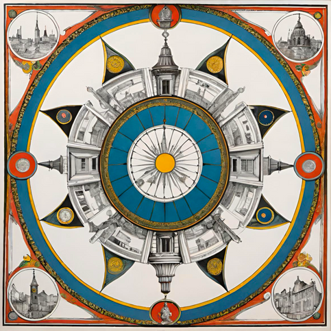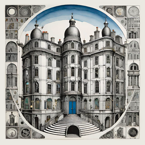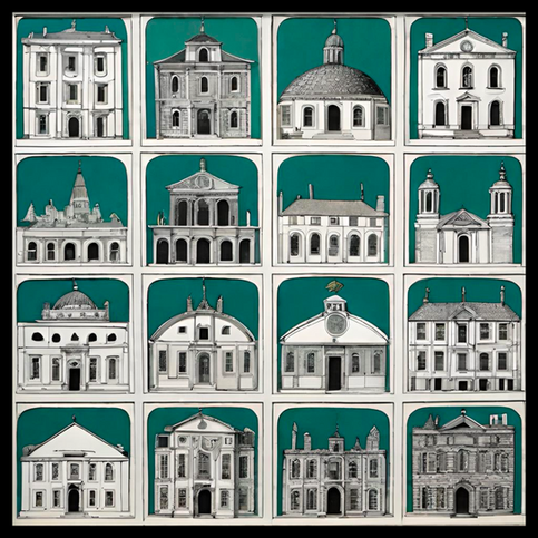 Each square is a miniature world: neoclassical facades, arcades, columns, and windows are reassembled with dreamlike symmetry, playful distortion, and impossible perspectives. AI echoes Fornasetti’s ornate line work and architectural obsession; reimagining temples, towers, and imagined palazzi with infinite variation and obsessive detail.