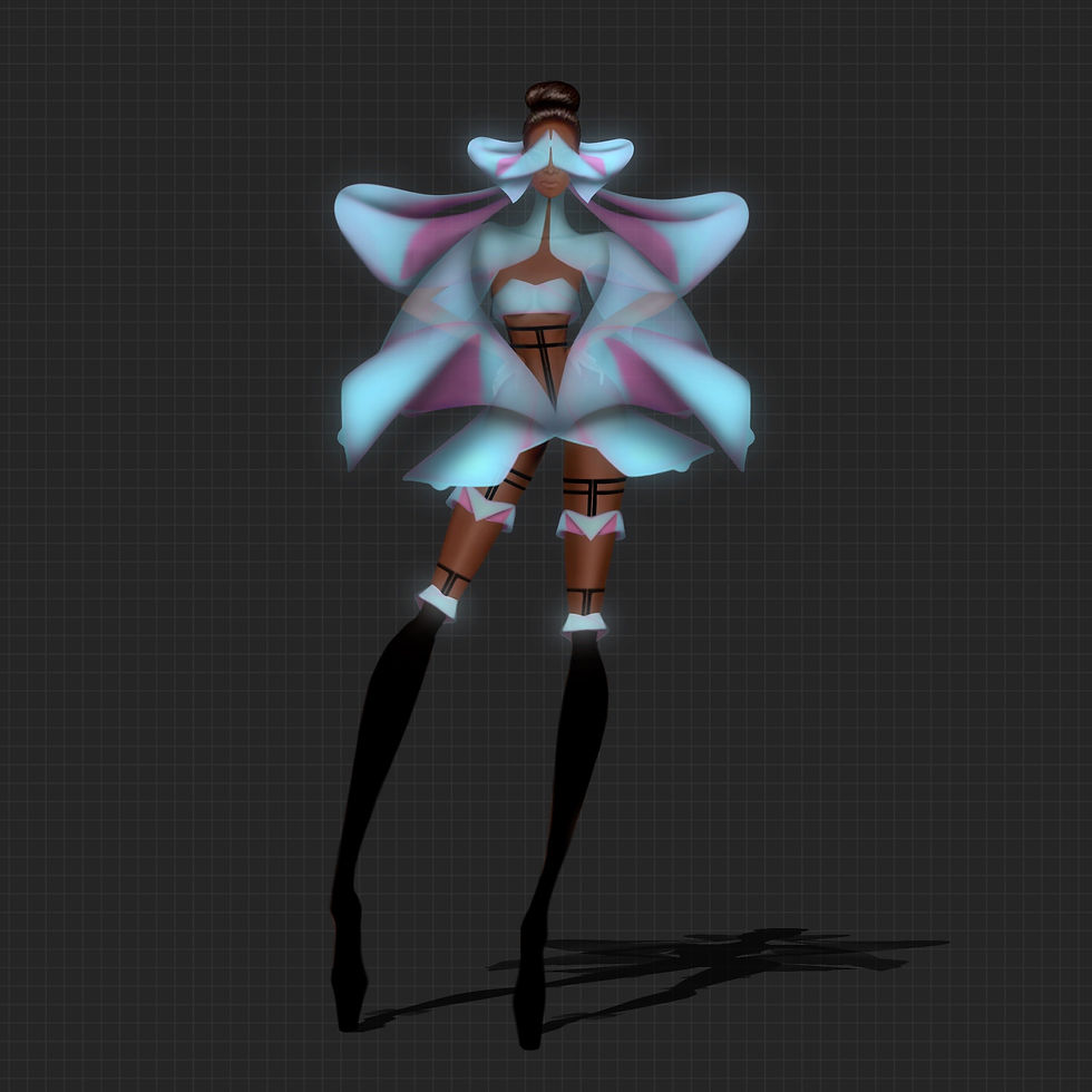Shapes emerge like digital topographies; organic, fluid, at times architectural. The garments appear to float in a liminal space, untethered from body or gravity, existing somewhere between fashion, sculpture, and dream. Colors shift in gradients, refract like holograms, or clash with electric contrast, amplifying a sense of depth and motion.