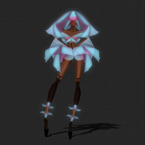 The process embraces a philosophy of digital collage and expansion; building volume, silhouette, and surface detail through the saturation of unexpected materials: metallic threads of light, molten plastic-like sheens, plush velvet simulations, crystalline overlays, and smoke-like transparencies. Each element is added not merely as decoration but as an essential contributor to the final composition’s emotional tone and spatial presence.