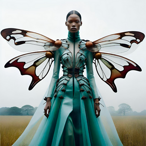 Jungle Mirage is an imaginative and dreamlike series of A.I.-generated fashion artworks that transports fashion into a fantastical jungle where reality blurs into the surreal. Drawing inspiration from the hypnotic patterns of exotic insects, the vivid hues of tropical birds, and the wild mystery of the rainforest, the collection fuses untamed nature with the unexpected logic of surrealism.