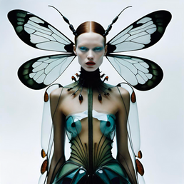 Garments take on organic, almost creature-like forms; cocooned silhouettes, iridescent carapace-like structures, and flowing fabrics mimicking the motion of wings and vines. Eyes appear where buttons should be, beetle shells morph into corsets, and leopard spots melt into abstract prints. Jungle flora and fauna are reinterpreted as dream symbols; oversized antennas, feathered limbs, and mirrored textures create a psychedelic visual language.