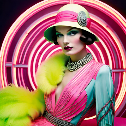 Neon Gatsby is an A.I.-crafted fantasy of excess, elegance, and reinvention. It's the Jazz Age recharged; a celebration of timeless silhouettes, electric color, and the unstoppable rhythm of style across eras.
