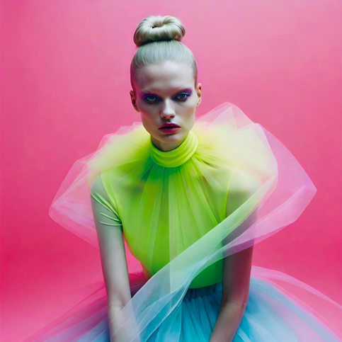 Urban Veil is a dynamic series of A.I.-generated fashion artworks that redefines streetwear with a bold, luminous edge. Here, the delicate airiness of tulle collides with the electric vibrance of neon, creating silhouettes that float between sport and spectacle.
