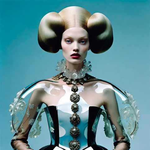 Vinyl Queen celebrates the theatrical beauty of Versailles while pushing it into an avant-garde realm; where fashion becomes a transparent throne, and the wearer, a sovereign of her own bold future.